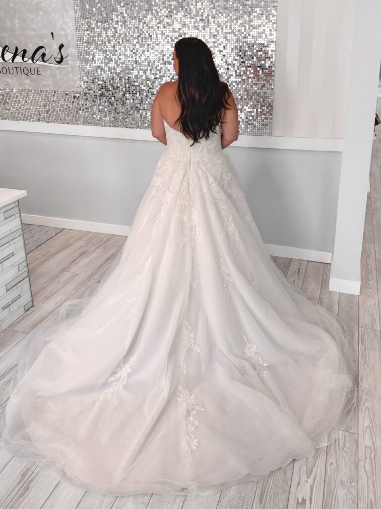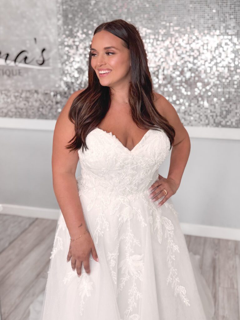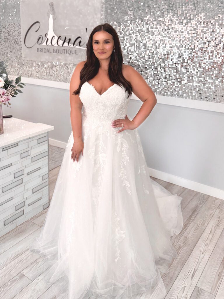 We are pleased to offer a diverse selection of sample gowns for our curvy brides! Sizes vary by designer but in general, our plus size gowns range from bridal sizes 18-28. The remainder of our sample gowns vary from sizes 6-16.